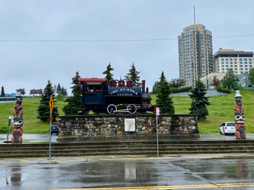 We woke up in Juneau the capital of cruise ships and Alaska. There were so many cruise ships at this port it was kind of crazy! I booked an excursion through the cruise line here, it was a self guided Jeep tour. It was fun but not something I would book again. The first stop of the tour was closed so we didn't even get to see it. The second stop was Eagle Beach. I'm sure on a sunny day this place would be incredible. It had lots of walking trails by the river and eagles were everywhere but they were all hunkered down because it was raining. Since it was drizzling and foggy it was hard to see but I'm sure on a day with better weather it would've been gorgeous. We were impressed with the amount of eagles that were perched all around. The next stop was Mendenhall Glacier, it was perfection! The rain and fog all lifted and a rainbow came out across the valley. We only walked out to the observation area and it was stunning! We made another bad choice and instead of walking out to Nugget Falls which takes you very close to the glacier, we decided to finish our Jeep tour. We left and made our way to Douglas Island and explored the beach there. It was nice but I would've preferred the hike to Nugget Falls. We made a pit stop by the Juneau Humpback Whale sculpture which is very beautiful. We returned our Jeep and decided to grab some lunch and explore a little. With 5 cruise ships in port it made it miserable to find something without a line. We finally found a restaurant and all I can tell you is it was very expensive, with a limited menu, and not very good or kid friendly at all. So we headed back to the ship as the city was just too crowded.