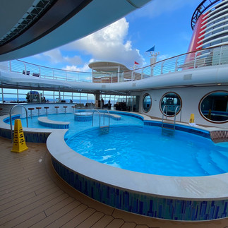Every day be sure to check the Disney Cruise App. for all the daily activities that are happening around the ship. The 18 and older activities will be marked as such. Daily there are mixology and liquor tastings around the ship. These tastings are an extra fee and you need to sign up prior to sailing but they're tons of fun. If just chilling by the pool or hot tub sounds like the perfect day head to the Quiet Cove Pool or Satellite Falls area in the 18 and older area. The Quiet Cove Pool offers a plunge pool and shallow sunbathing pools. The Disney Fantasy has devoted a very large deck space at the front of the ship for the adult guests. The Jacuzzi in this area are glass bottomed so on a day at sea you would be able to see down into the ocean.